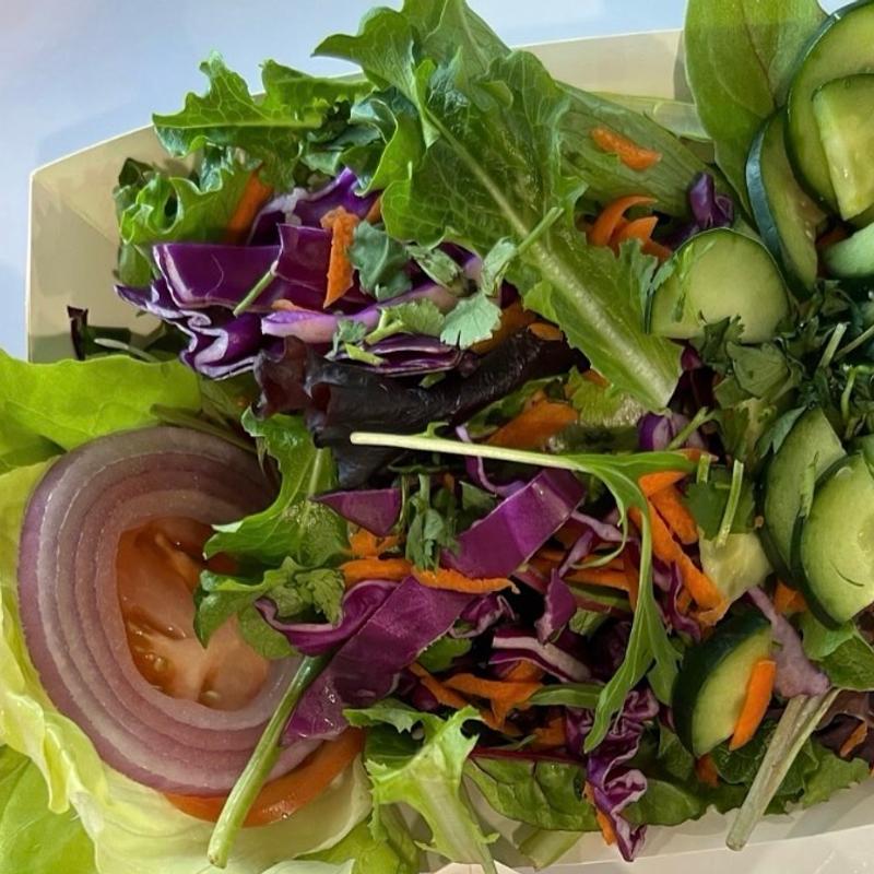 Served on a bed of seasonal hydroponically grown butter lettuce, seasonal mixed greens, red onions, radishes, carrots, red cabbage, cucumber, tomato, cilantro, balsamic vinaigrette | Cal 45