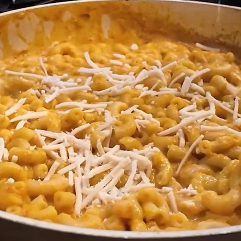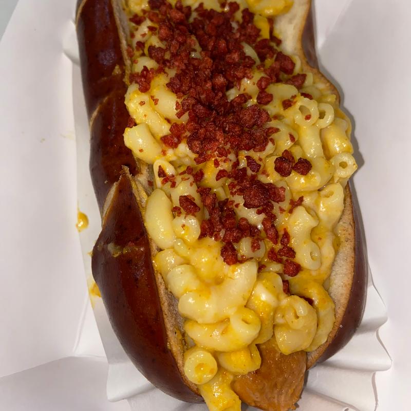 Vegan hot dog, topped with macaroni pasta tossed in a creamy cauliflower cashew cheese sauce, bacon bits on a pretzel bun | Cal 384 | Allergen