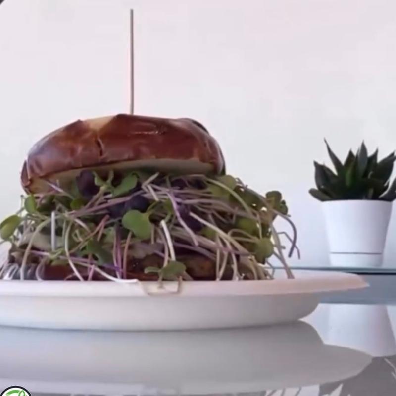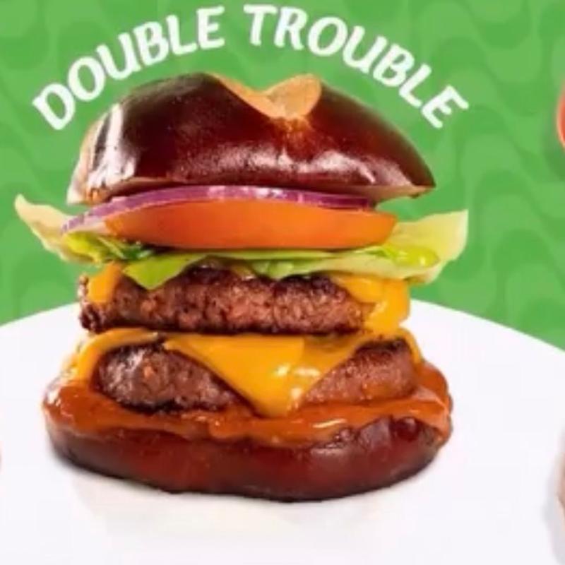 It’s 22 out of 20! Two Beyond Meat plant-based patties, hydroponically grown butter lettuce, tomato, red onions, double American plant-based cheese, special sauce on a pretzel bun | Cal 800