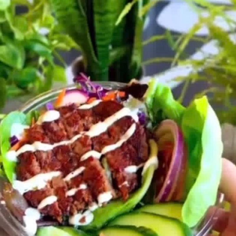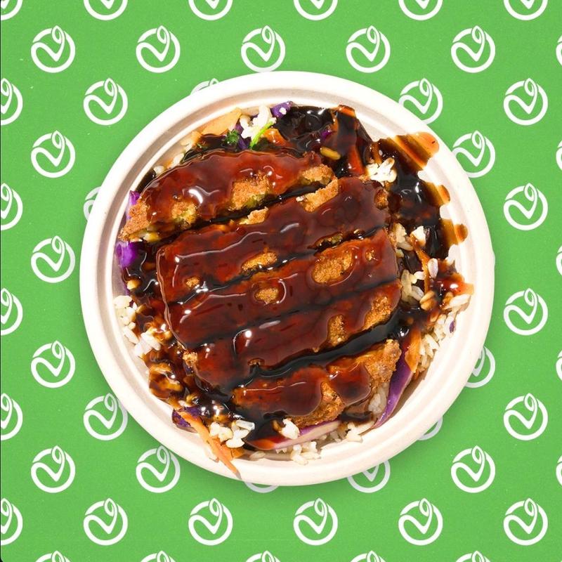 Meatless chick'n filet breaded with Japanese bread crumbs, brown rice, radish, carrots, red cabbage, sauteed red onions, cilantro and teriyaki sauce | Cal 396