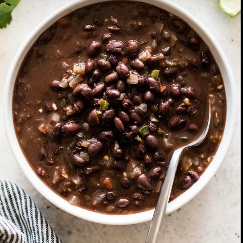 Slow-cooked black beans, smoked bacon bites, garnished with cilantro, red onions and mozzarella cheese | Cal 180