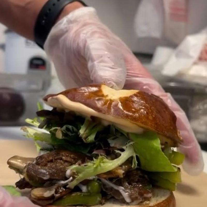 House-made mushroom patty (portobella, bella, shitake), topped with plant-based pepper jack cheese, caramelized onions, pickles, Southwestern smoke sauce, microgreens, on a pretzel bun | Cal 650