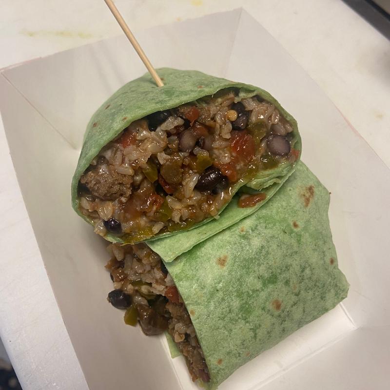 Meatless beef strips, chili, black beans, brown rice, jalapeno, caramelized red onions, cilantro, on a spinach wrap | Cal 680