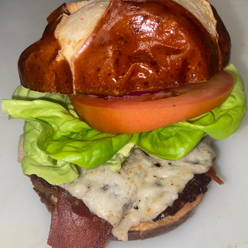 Beyond Meat plant-based patty, hydroponically grown butter lettuce, tomato, red onions, guacamole, bacon, tahini, pepper jack plant-based cheese on a pretzel bun | Cal 600