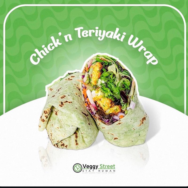 Meatless chick'n filet breaded with Japanese bread crumbs & spices, mixed greens, red cabbage, carrots, red onions, cucumber, radish, teriyaki, on a spinach wrap | Cal 590