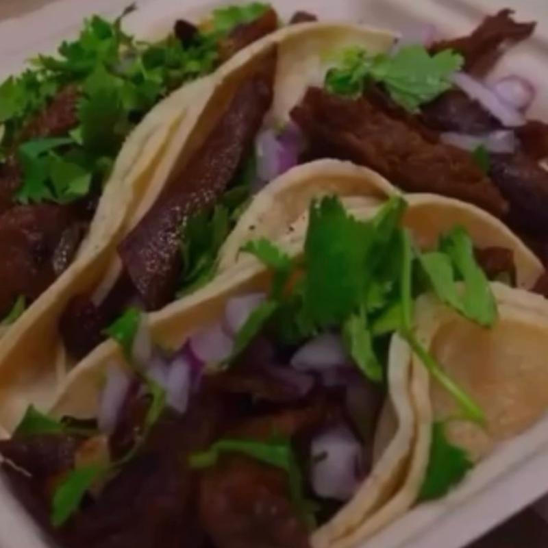 Corn tortilla, beef strip tossed w/hot chili, red onions, cilantro, tomato, guacamole and salsa verde | Cal 360 per taco