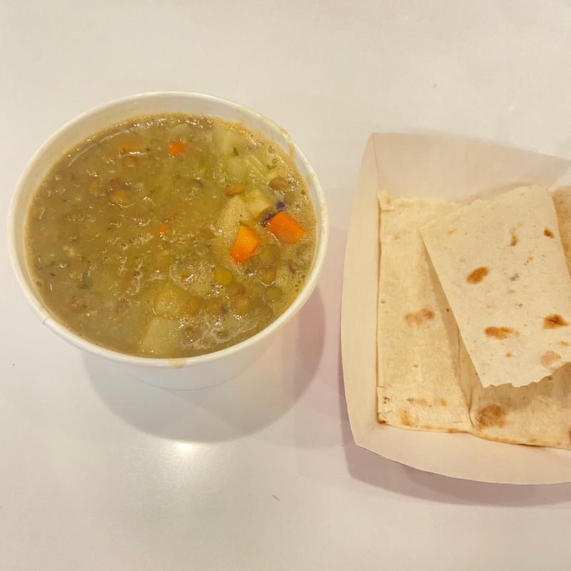 Mediterranean lentil soup made with warming carrots, potatoes, and celery, infused with turmeric, tomato and aromatic herbs. Served with warm lavash bread | Cal 139